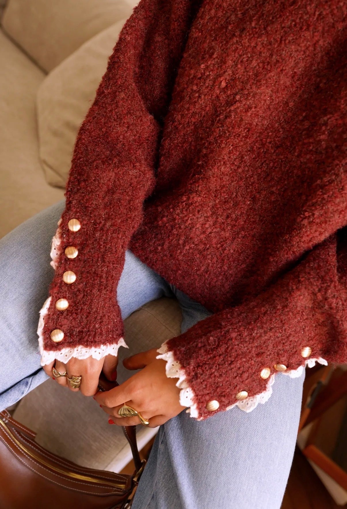 Pull en laine bouillie avec détail de la dentelle au col et en bas de manches